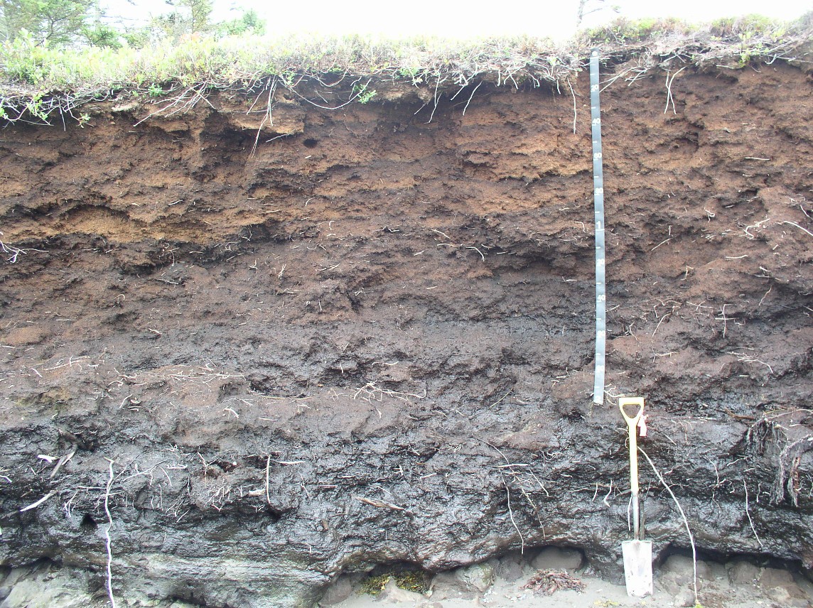 This is a large outcrop (a deep cut exposing soil and geologic deposits) of a raised peat bog, refereed to locally as "Heaths" (Pronounced "hayths" locally and "heeths" by folks not from Maine). The outcrop is located on a coastal bluff (see topo map link below for a location map) facing north in the town of South Lubec, Maine. The area is interpreted to have once been an enclosed kettle bog surrounded by upland but land area to the north has been eroded away by coastal erosion Tides in this area are about 12 feet, some of the largest tides in the U.S., at high tide the sea water rises to the 2 meter mark of this outcrop. The soil mapped in this area is a complex of Moosabec and Sebago soils. The upper 150 cm of this photo consists of thick layers of fibric spangnum peat (Oi horizons - lighter colored soil) and thin layers of black sapric material (Oa horizons). From 150 cm to approximately 250 cm the soil consists mainly of black sapric woody organic material (numerous Atlantic White Cedar stumps occur at this depth). The mineral material below consisted of bog iron material (Bsm horizon??).