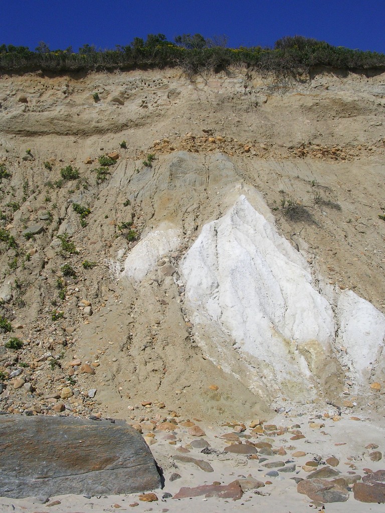 This sea cliff outcrop is on the northeast side of Block Island, Rhode Island. It is the first view of the Islands geology as you approach Old Harbor via ferry. This outcrop consists of a thick loess cap (silt loam soil textures) underlain by stratified outwash and deltaic beds. Below the outwash is mixed till, lake floor deposits, and glacially thrusted Cretaceous clay blocks. Numerous bank swallow nests are built in the loess cap of the Bridgehampton soils mapped in this area.