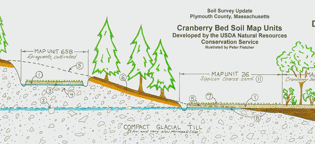 Soil areas used for the production of cranberries (cranberry beds) are delineated on the updated soil maps for Plymouth County, Massachusetts based on the type of soil prior to the construction of the beds. Beds constructed in upland areas are delineated based on the hydrologic conditions (apparent or perched water table) and landscape position (elevation) of the beds in relation to the adjacent "natural" beds constructed in wetlands.