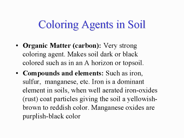 In general; black colors indicate organic matter (carbon), reddish-yellowish brown colors indicate iron oxides and well-drained conditions, blotchy color patterns are caused by saturation and reduction by a water table.